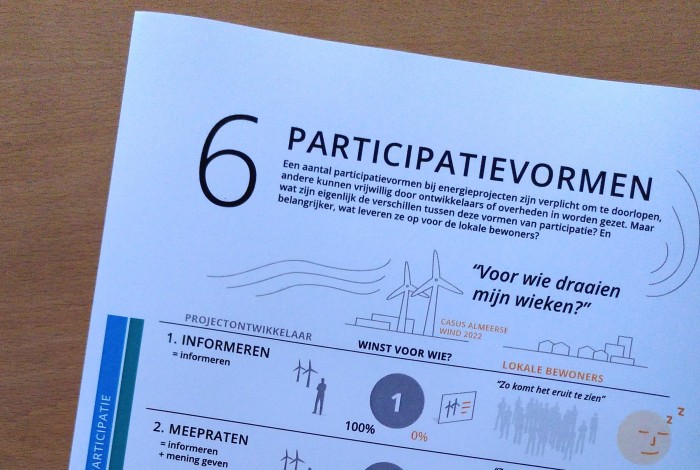 Energie van Flevoland heeft een infographic laten maken waardoor de verschillende participatievormen bij een nieuw energieproject zichtbaar worden voor bewoners en lokale overheden in Flevoland. Daarnaast laat de infographic ook zien wat omwonenden precies krijgen bij de gekozen participatievormen. Want niet iedere participatievorm levert een lokale gemeenschap evenveel op. Procesparticipatie gaat over meepraten en meedenken over waar een energieproject komt en hoe het eruit gaat zien. De opbrengsten zijn voor de ontwikkelaar. Financiële participatie levert de gemeenschap wel wat op. Toch, obligatie-uitgifte levert alleen wat op voor bewoners die geld over hebben om te investeren. Een gebiedsfonds of omwonendenregeling is voor de hele gemeenschap, maar in de praktijk vloeit er slechts een fractie van de opbrengsten naartoe. Flevoland is koploper als het gaat om het betrekken van burgers bij energieprojecten. Maar kijk je goed naar de infographic dan zie je dat ook in Flevoland lokaal eigendom volgens bovenstaande definitie niet veel voorkomt. Er is een infographic die de opbrengst van de windmolens van Almeerse Wind in 2022 laat zien. Er is ook een invulblad beschikbaar. Hiermee kunnen Flevolanders zelf aan de slag met toekomstige energieprojecten.